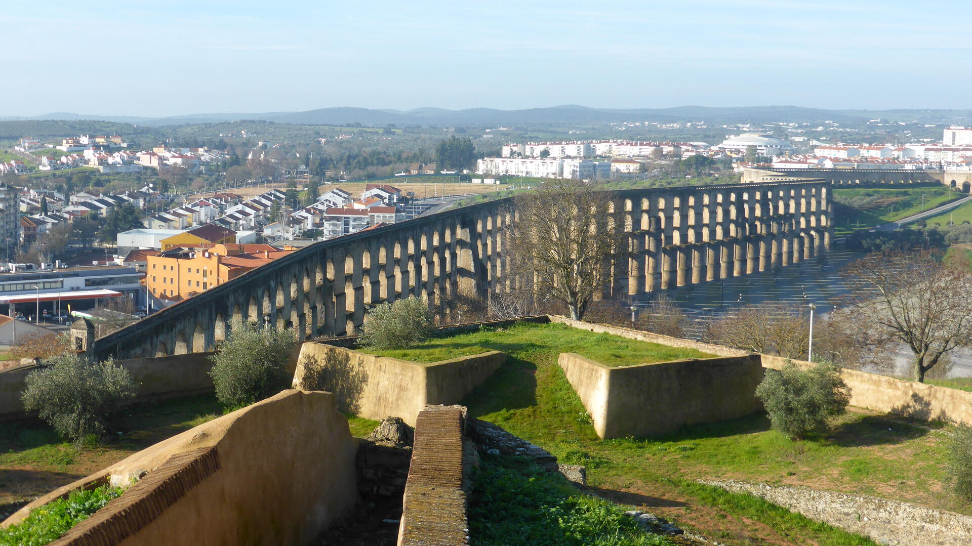 The site, extensively fortified from the 17th to 19th centuries, represents the largest bulwarked dry-ditch system in the world. Within its walls, the town contains barracks and other military buildings as well as churches and monasteries. While Elvas contains remains dating back to the 10th century ad, its fortification began when Portugal regained independence in 1640. The fortifications designed by Dutch Jesuit padre Cosmander represent the best surviving example of the Dutch school of fortifications anywhere. The site also contains the Amoreira aqueduct, built to enable the stronghold to withstand lengthy sieges.